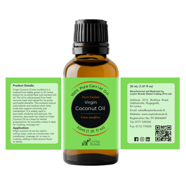 Virgin Coconut Oil 30ml – Carrier Oil – Pure & Ayurvedic in Sri Lanka for Hair, Skin and Cooking